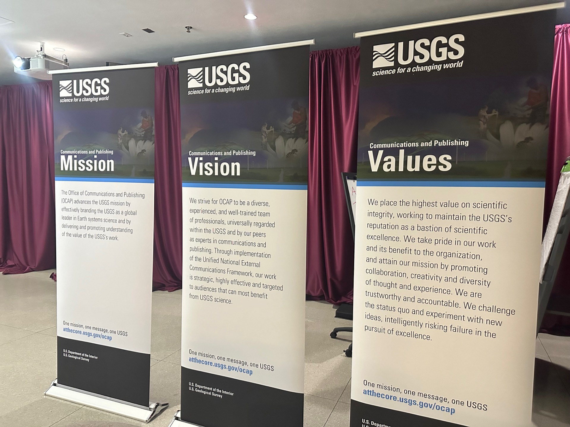 3. Branded exhibit banners that were positioned around the entire auditorium highlighting USGS Mission, Vision, Values, and the USGS Unified National External Communications Framework principles.