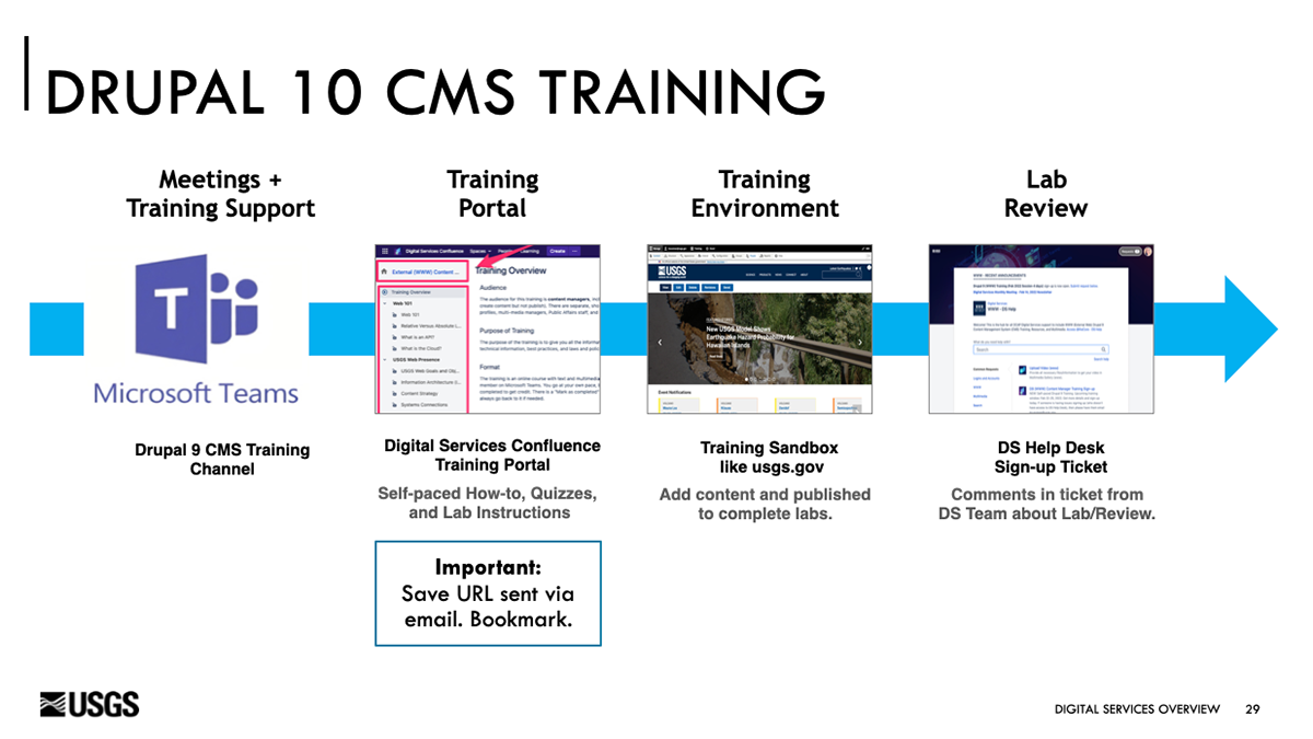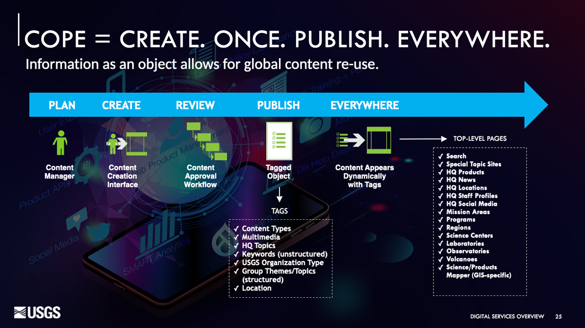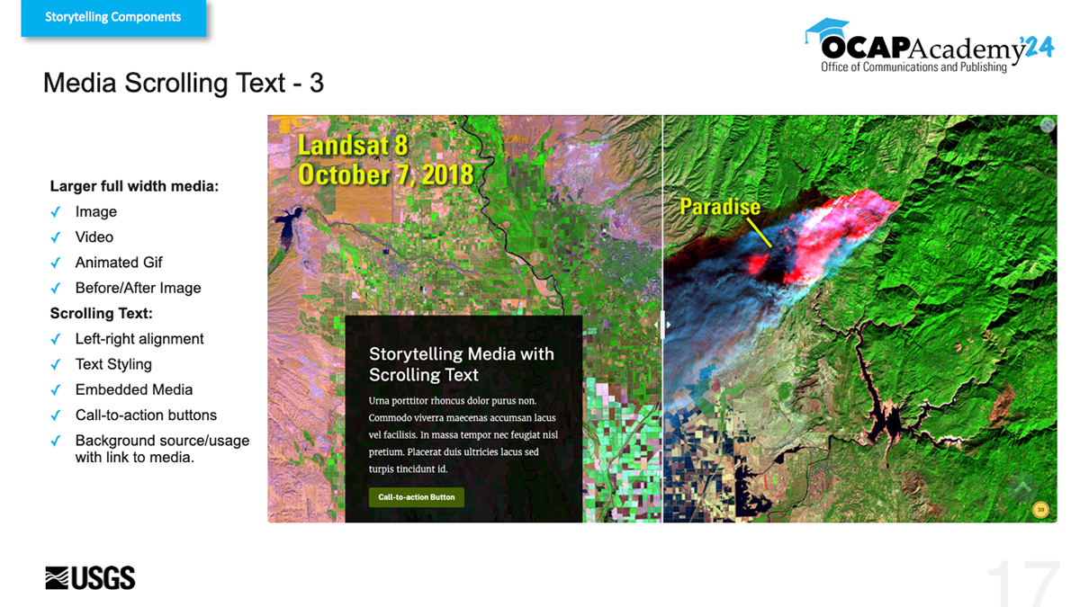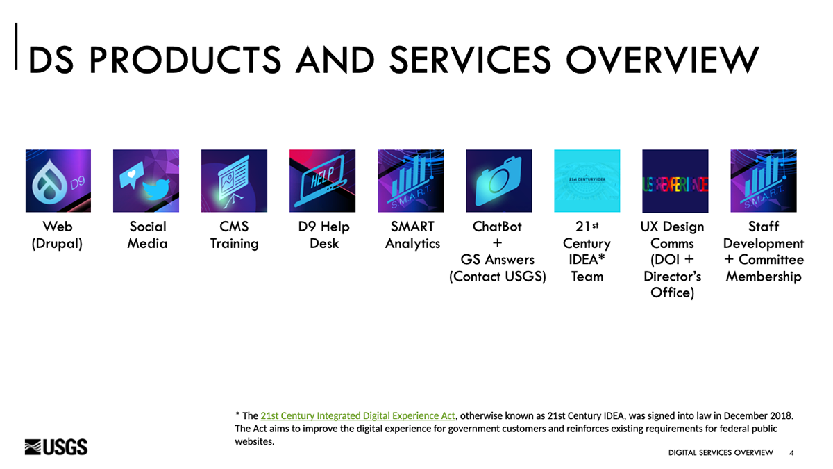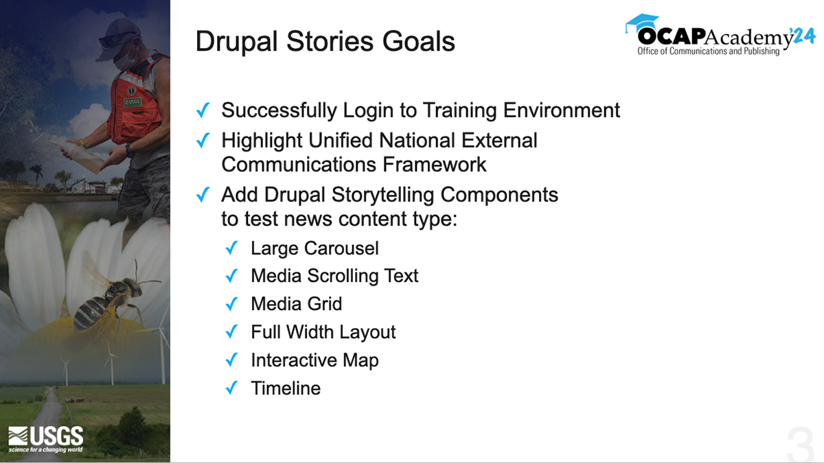 I also presented sessions on various topics to include the New Drupal Storytelling Web Components (two sessions) and Communication Planning Part 4 using S.M.A.R.T Analytics and received two USGS "Star Awards" for production of all branded communications listed above and the three presentations conducted during the event.
