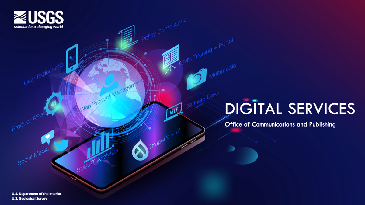 As part of the Digital Services (DS) Team within the USGS Office of Communications and Publishing, I led efforts in strategic communication branding, visual design, presentations, and training materials. I also supported the Director's Office by designing and producing a wide range of high-level communication products, including COVID-19 response presentations, infographics, internal messaging, All-Employee Town Hall graphics, Presidential Transition communications (every four years), and annual Budget Rollout materials.