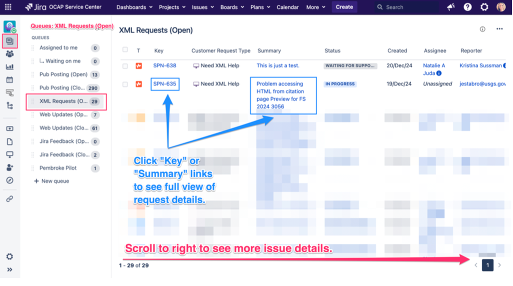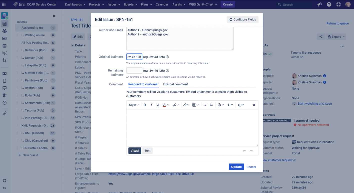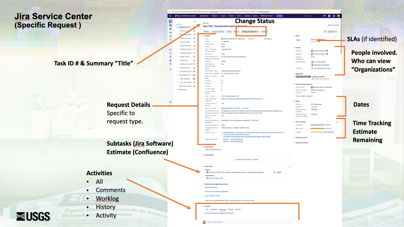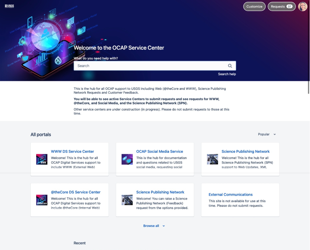 For teams providing customer support to all of USGS, teams including Digital Services (DS) and Science Publishing Network (SPN), customized service desk portals were developed to support those teams and their internal stakeholders. For each service center I designed and maintained customer request types, forms, queues (back-end view for developers), workflows for each issue type, and specific SLAs to support each team's processes and business needs. Depending on the project and customer request types, automation rules were implemented to quickly triage requests to specific service desk team members and notify stakeholders to reduce manual effort and increase efficiencies. The SPN also utilized features of tracking time and billing within their service management project. For each service center, a knowledge base was linked to help internal stakeholders quickly find related articles to improve customer service and reduce unnecessary request volume. I also designed dashboards for service desk team members and internal stakeholders to see reports, monitor SLAs, trends, and team performance. Using the metrics and feedback allowed for continuous improvement and validation of teams providing excellent customer service.