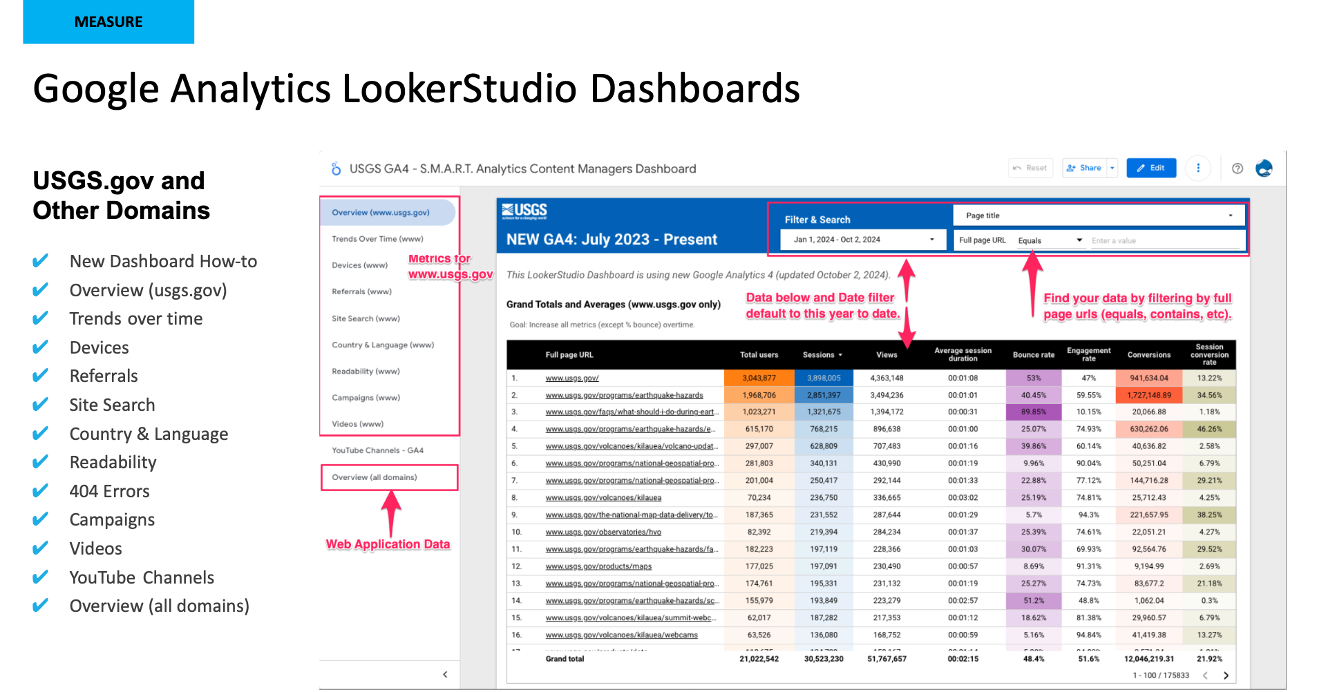 A major tool of capturing the usgs.gov user interactions is Google Analytics. I have created multiple Google Analytics LookerStudio Dashboards for various internal audiences to access data to easily understand whether we are supporting our users' needs, business objectives, and content strategies.