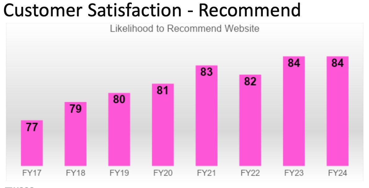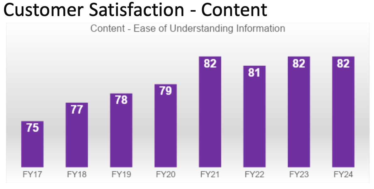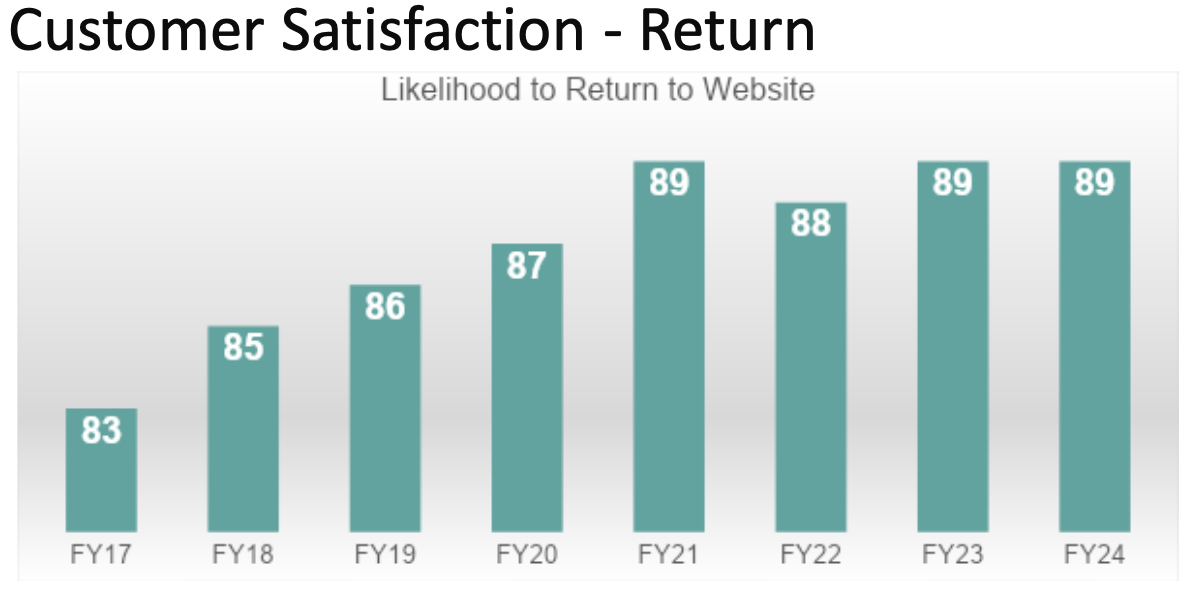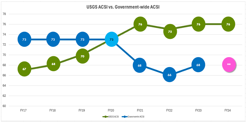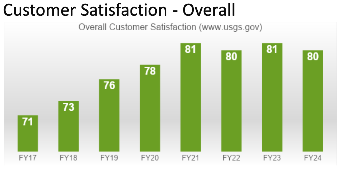 The USGS web presence, our flagship usgs.gov is delivering science and data information and is highly rated by the public. The chart below demonstrates USGS compared Government website trends of citizen experience. The American Customer Satisfaction Index, ACSI, is a national cross-industry measure of customer satisfaction in the United States. (FY24 Government-wide ACSI score not available at time of presentation). Also usgs.gov has performed well since the migration into one consistent Drupal website experience back in April of 2016. See customer satisfaction data trends of overall customer satisfaction, likelihood to return to website, likelihood to recommend, and ease of understanding content. This data is a measurement of success and validates the USGS goals and content strategies.