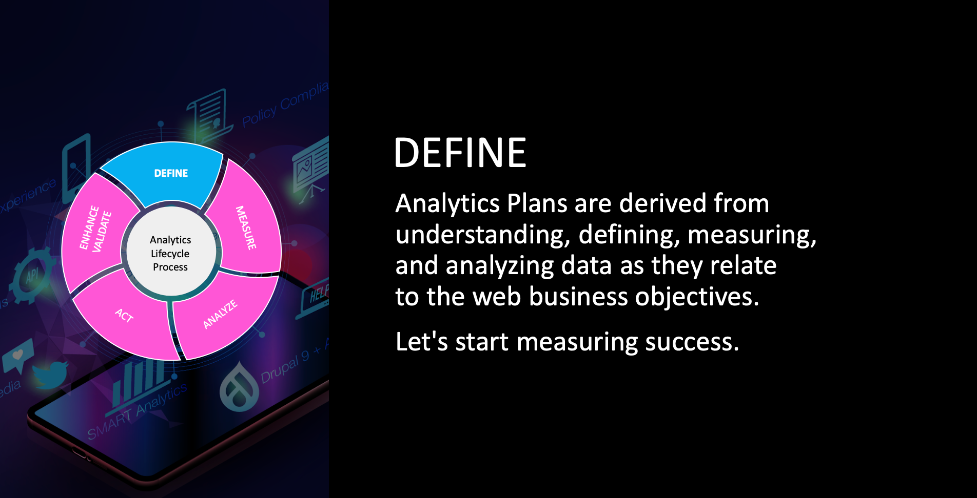 Yearly, I update and enhance our master S.M.A.R.T. Analytics Plan with key performance indicators (KPIs), targets, dimensions using various tools and dashboards for leadership and stakeholders to make data-driven decisions. Recommending and developing new tracking methods because of gaps in data, target adjustments, or other management needs is another responsibility that occurs throughout our reporting cycles. The USGS S.M.A.R.T. Analytics Plan is derived from understanding, defining, measuring, and analyzing data as they relate to the web business objectives.